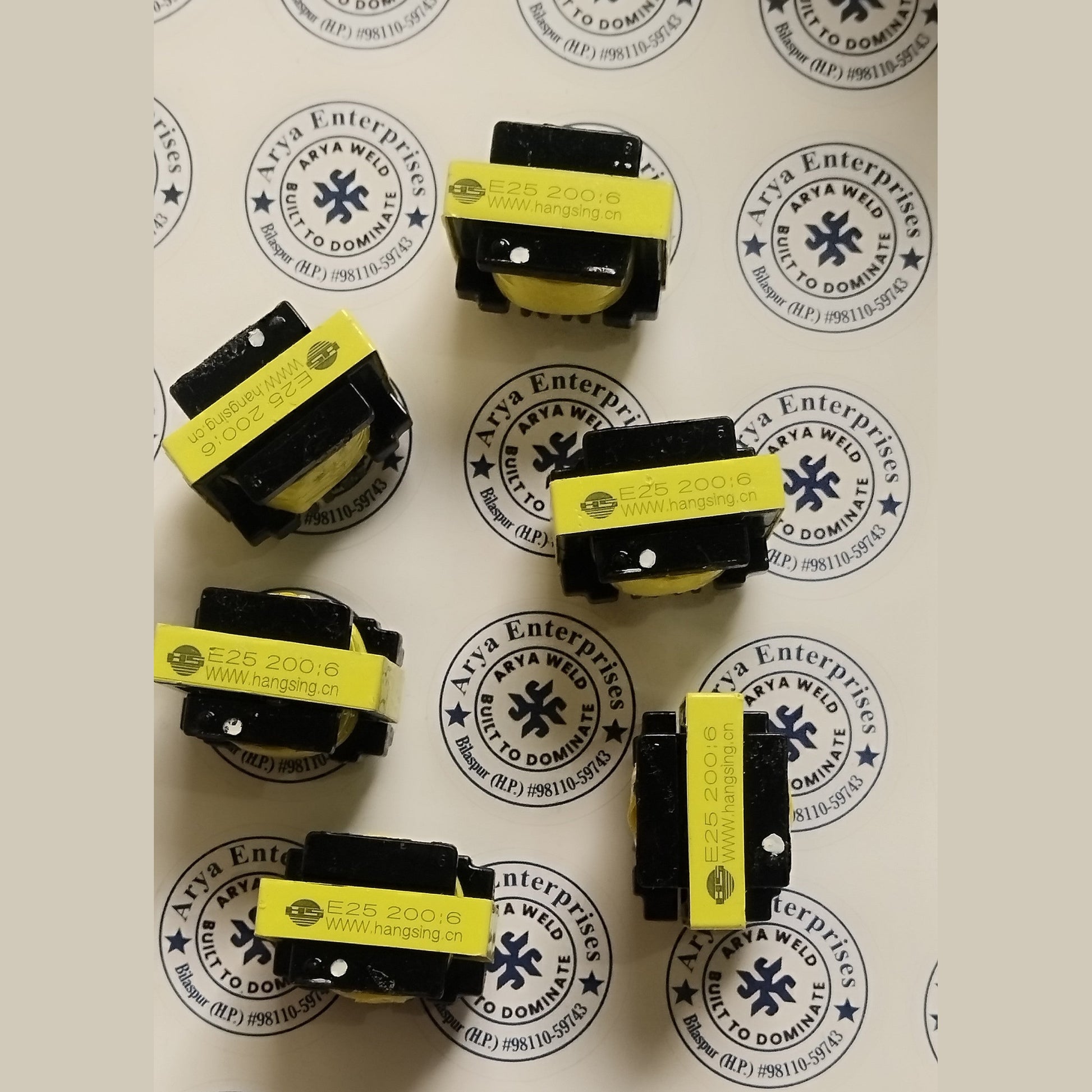 The EE25 200:6 is a compact, high-frequency, single-phase transformer designed for switching power supplies, particularly in IGBT inverter welding machines (e.g., ZX7-200). It features a 200:6 turn ratio, high efficiency (>95%), and operates between 10kHz-1MHz. The transformer is used for voltage reduction and isolation, with 3-4 windings.